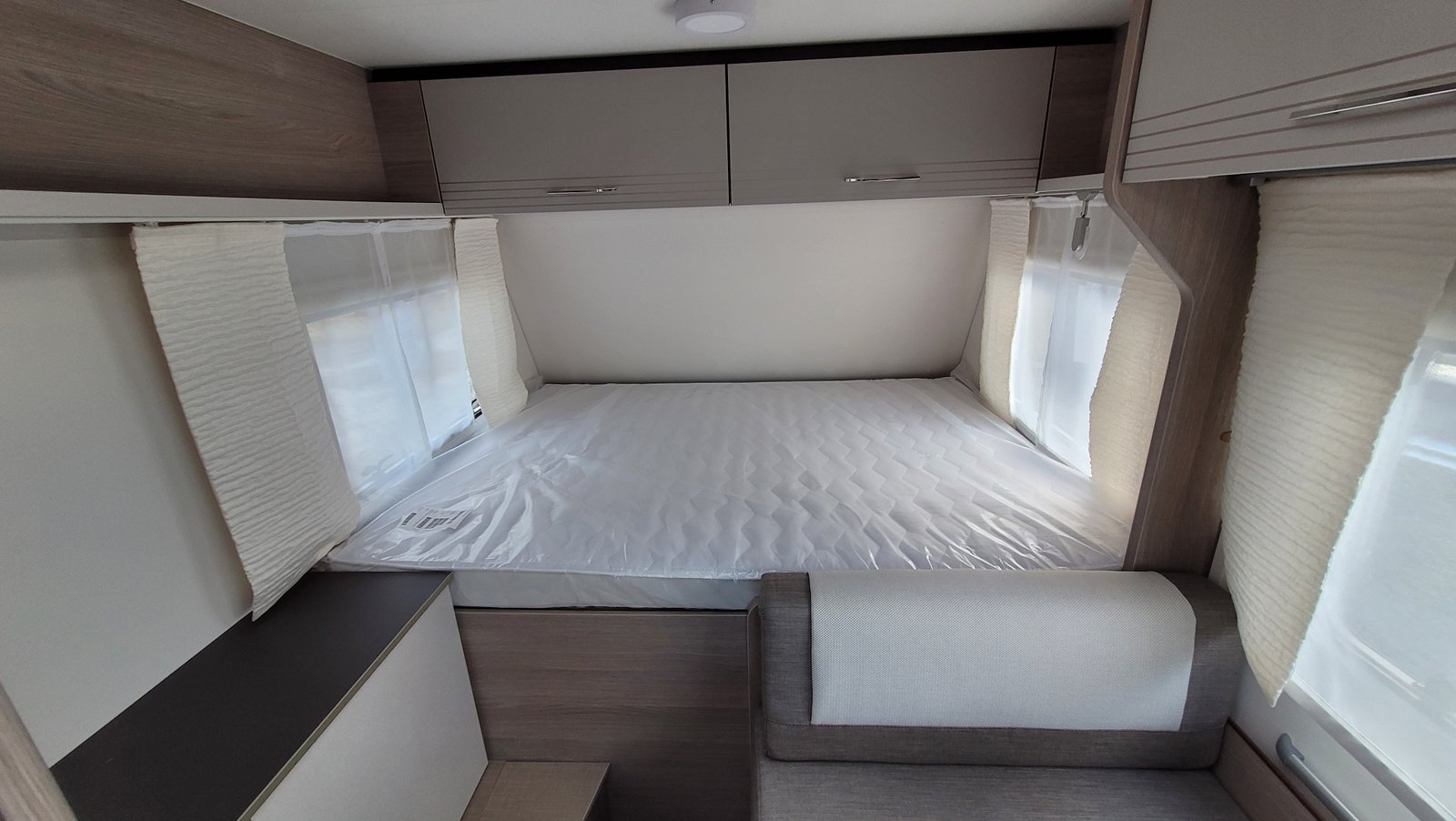 Le modèle propose un couchage principal à l’avant avec un plateau de 190 x 152 cm, ainsi qu’un second couchage central de 180 x 90 cm, permettant d’accueillir jusqu’à quatre personnes. L’agencement intérieur est pensé pour maximiser l’espace et offrir une utilisation pratique au quotidien.