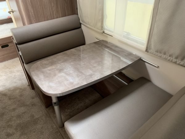 Elle propose quatre couchages permanents, garantissant un confort immédiat sans nécessiter de transformation quotidienne. Pour plus de flexibilité, la dînette centrale peut être convertie en couchage supplémentaire, permettant d’accueillir jusqu’à cinq personnes. Cette configuration en fait une caravane parfaitement adaptée aux séjours en famille ou entre amis.