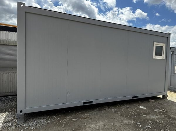 La structure du conteneur est solide et durable, avec des panneaux sandwich assurant une bonne isolation thermique et phonique. La présence d’une porte standard positionnée sur un petit côté facilite l’accès et la circulation à l’intérieur du module.