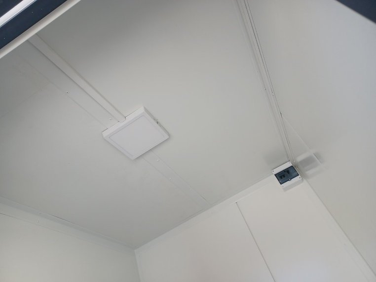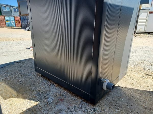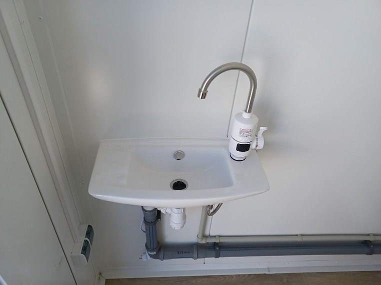 Le conteneur dispose d’un système électrique avec raccordement en 230V, permettant l’alimentation des équipements intégrés. Un chauffe-eau à débit est installé directement au niveau du robinet, garantissant la disponibilité immédiate d’eau chaude. La porte d’une largeur de 75 cm assure un accès facile, tandis que le système de ventilation par gravité permet un renouvellement d’air constant pour maintenir un environnement sain.